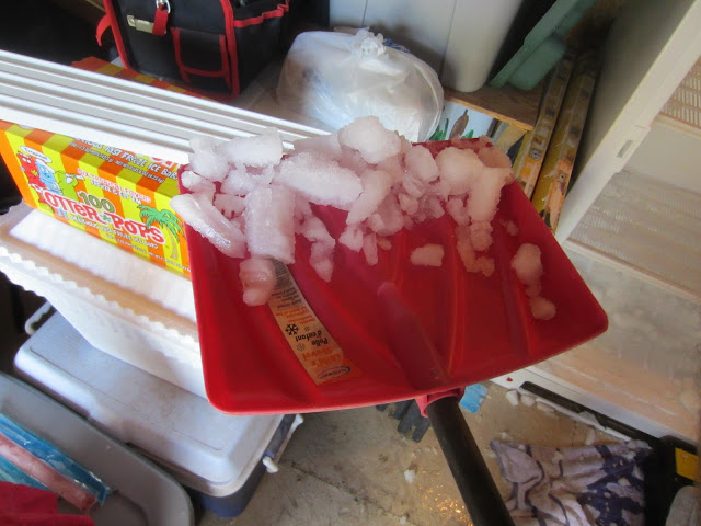 Every five or ten years I notice that our upright freezer has too much ice clogging up the shelves so I reluctantly decide to do something about it. Since there was (I'm not exaggerating) 3-4 inches of ice surrounding the two top shelves and bits of frozen food were beginning to be glued to the shelves by ice that was trying to surround it (yeah, I should have done this a long time ago, but I don't spend that much time gazing into the freezer so the project is out if sight and out of mind) it seemed like a good time to take on this job.